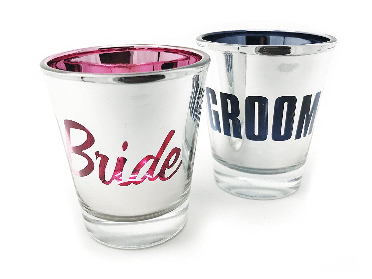 Sharp looking bride and groom shot glass set is made of heavy glass with a mirrored finish giving it a festive look. 1 bride and 1 groom shot glass.