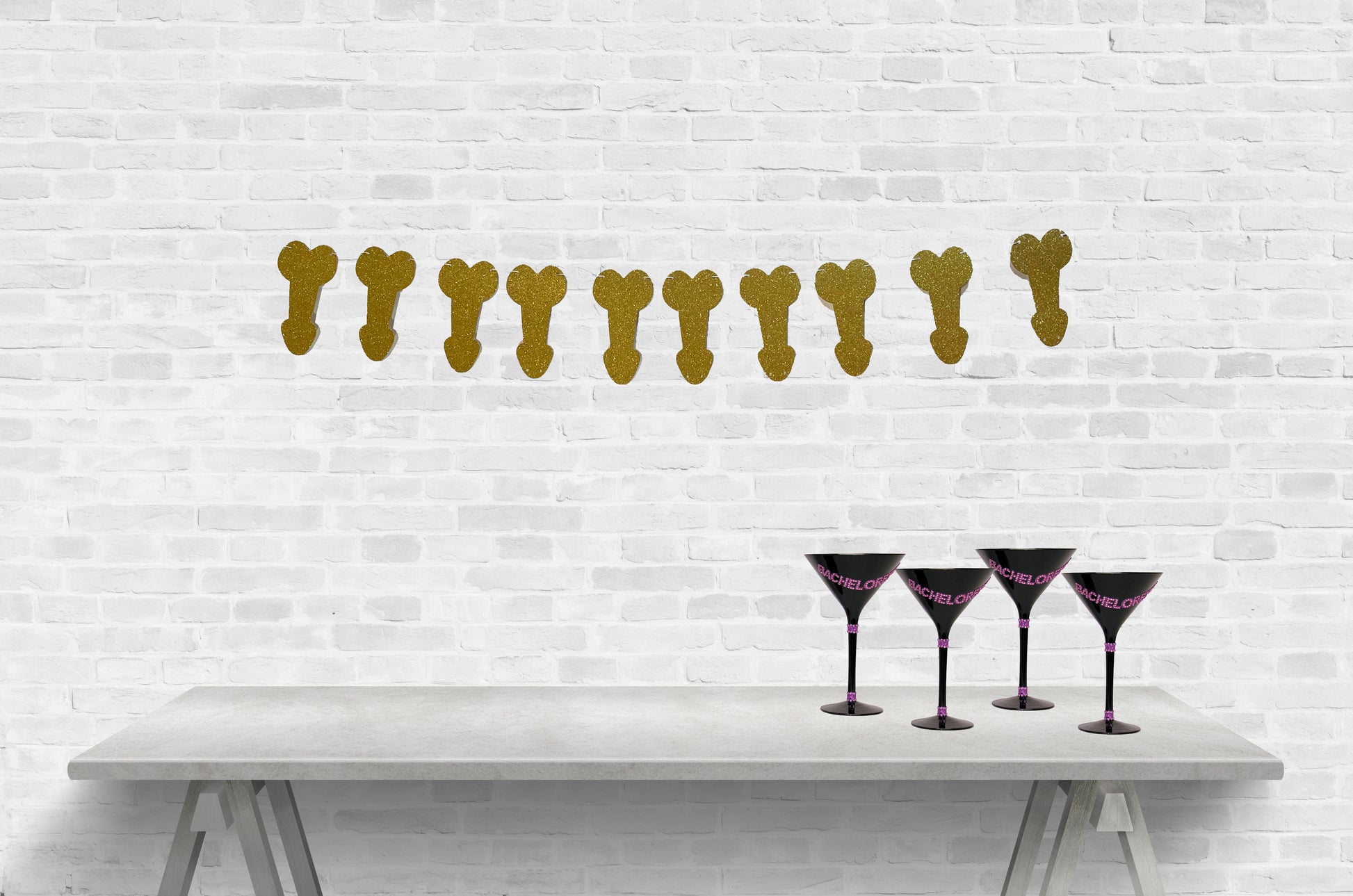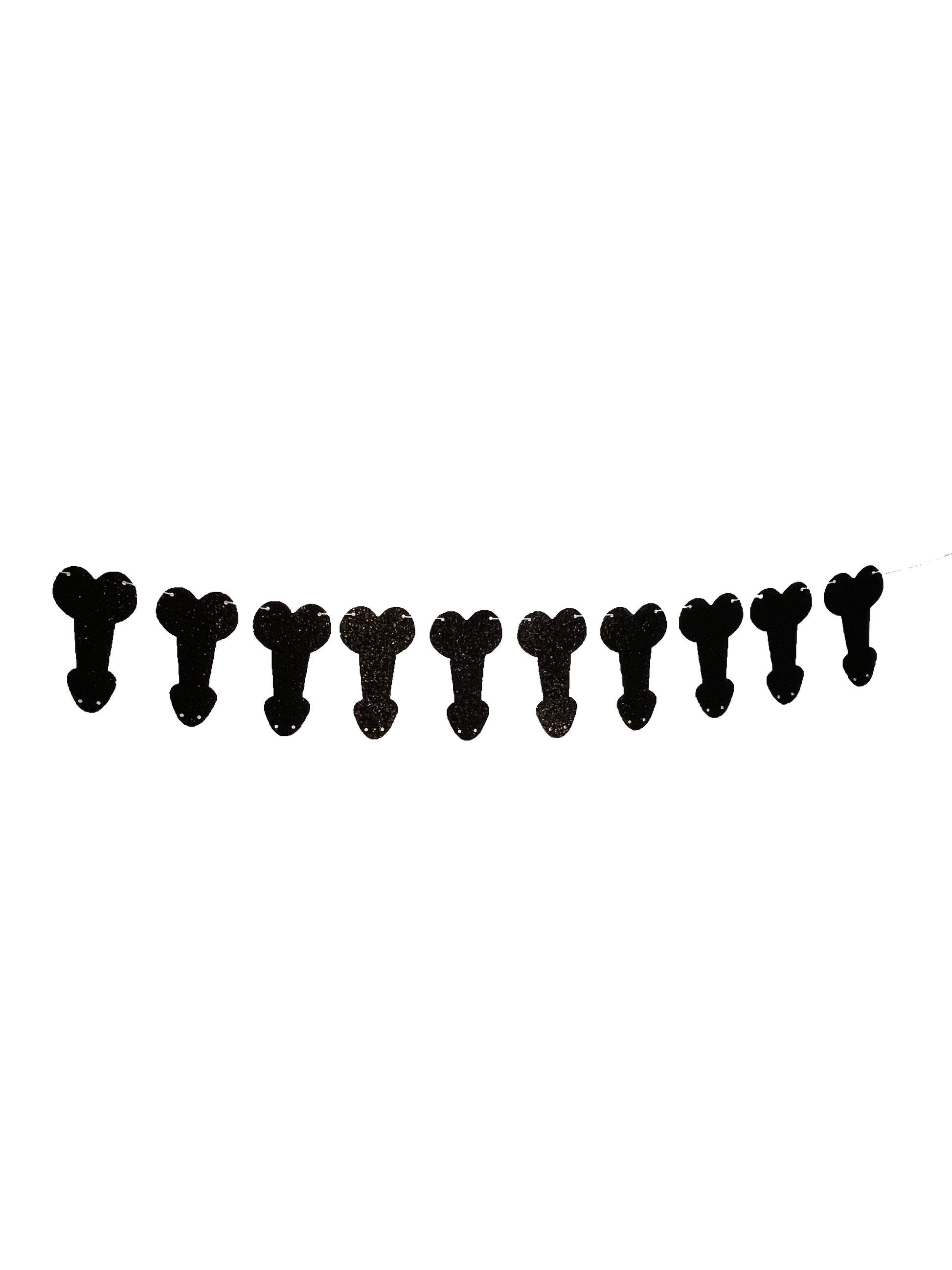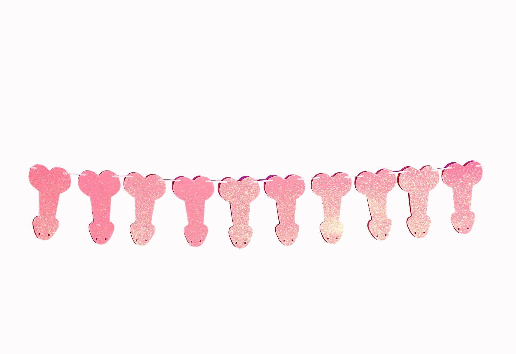 Our Glitter Dick penis banners are the perfect addition to your bachelorette room decor. Each glitter cardstock peckers is 5 1/2" by 3 1/2." There are 10 peckers per banner. The banner will measure 4 1/2 to 5 feet when you hang it and space out the dicks. You can change the direction of the penises in the banner by using the punched-out holes in either the top or bottom of these sparkly peckers. The peckers are hung on a satin ribbon and it is already pre-strung and ready to hang. This banner will add just a bit of naughty color to your hotel room or house party. For extra party fun add matching Glitter Dick Straws or Confetti!